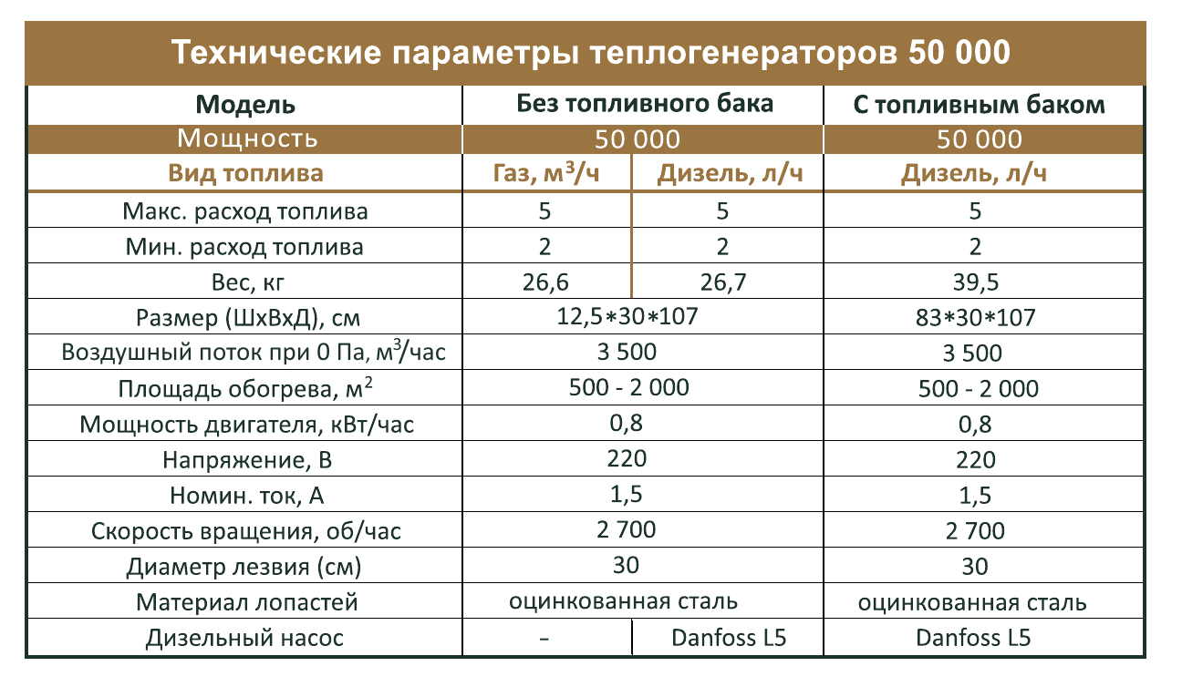 Данные теплонагреватели, в зависимости от конфигурации, работают на двух видах топлива и представлены в двух моделях — с/без топливного бака.
